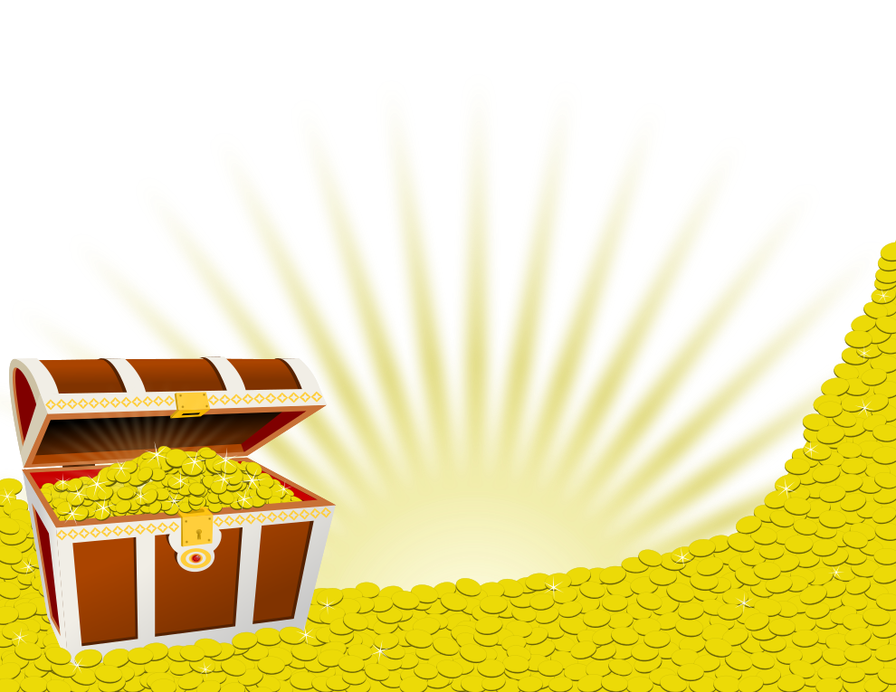 This features a red chest filled with gold coins, sitting on top of a pile of yellow coins. The chest is open and appears to be overflowing with the shiny gold pieces. The scene gives off an impression of abundance and wealth. In addition to the main chest, there are several other smaller chests scattered around the area, adding to the overall richness of the scene.