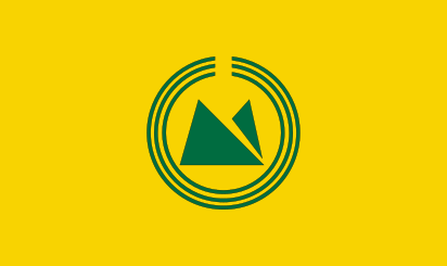 This features a yellow flag with three green circles in the middle of it. These circles are surrounded by two gray triangles, creating an interesting pattern on the flag. The overall design is visually appealing and stands out against its background.