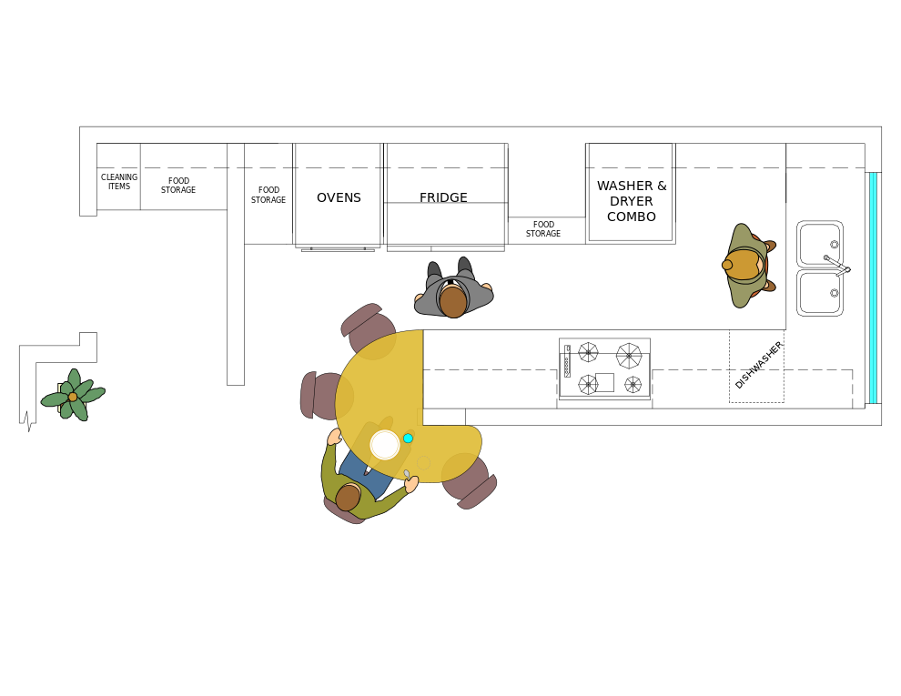 This is a cartoon drawing of a kitchen, featuring various objects and people. In the center of the scene, there is a person sitting on top of a yellow object that resembles a toaster oven or microwave. Another person can be seen in the background, while a third person is located near the right side of the image. The kitchen is filled with various appliances and items, including an oven situated towards the left side, a sink on the right side, and a refrigerator positioned at the top-left corner. There are also two bowls placed in different areas within the scene, one near the center and another closer to the bottom-right corner. Additionally, there is a cup located near the middle of the image, and a spoon can be seen on the right side. A chair is situated at the top-left corner, while a book rests on the left side of the kitchen area.