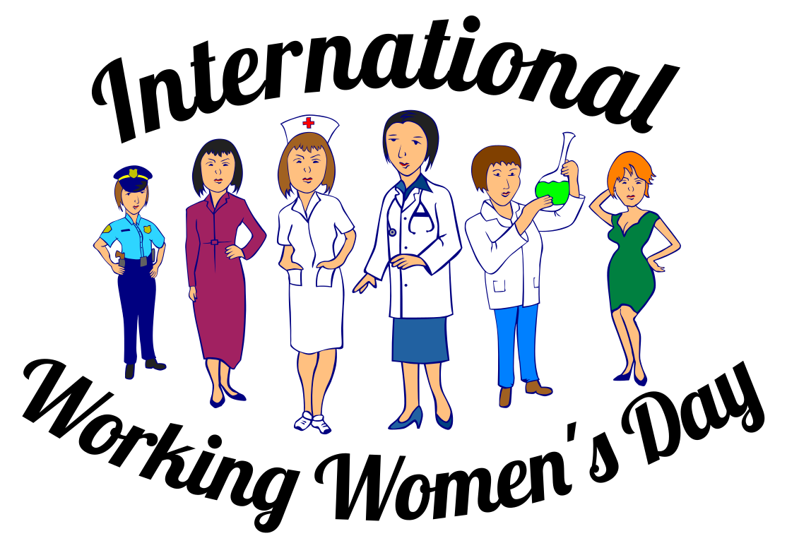 This features a group of six women, each representing different careers. They are standing next to each other in front of the words "International Working Women's Day." Each woman is dressed in professional attire, with one wearing a nurse's outfit and another holding a green bottle. There is also a police officer present among the group. The women appear to be posing for a picture or promoting an event related to International Working Women's Day.