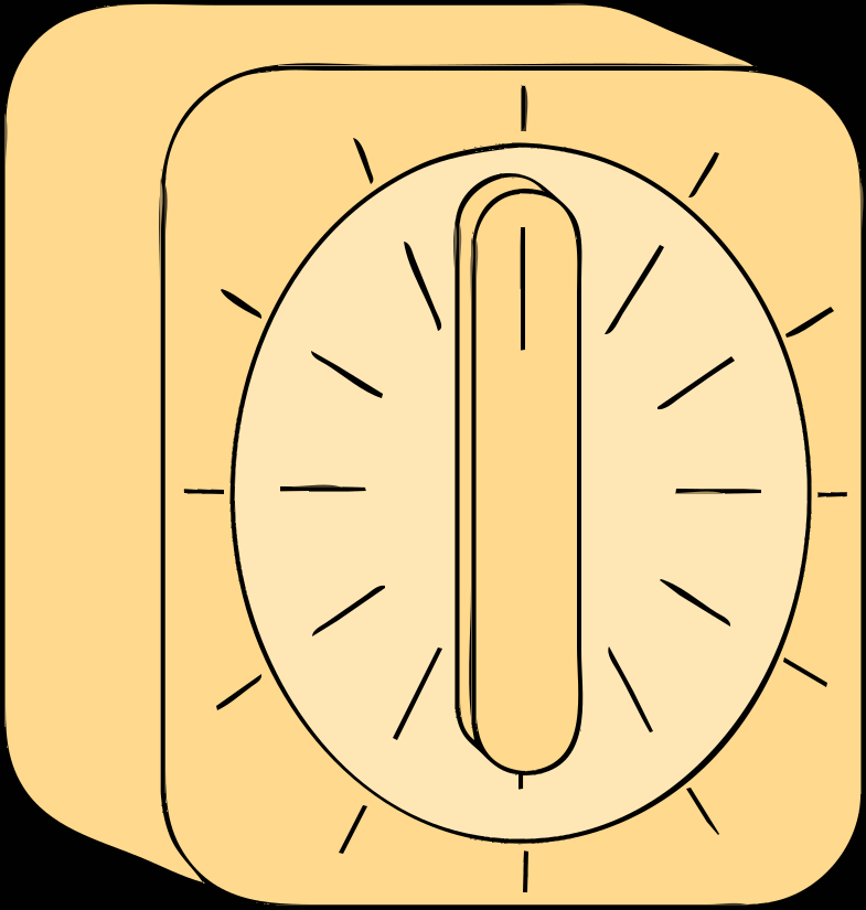 This features a yellow timer with a dial on it. The timer is designed to be used in the kitchen, and it has a unique appearance that sets it apart from other timers. It can be wound up by turning the dial, set by turning it back, and it will ring and bounce when activated. This timer seems to have been drawn or illustrated with great attention to detail, making it an interesting and visually appealing piece of artwork.