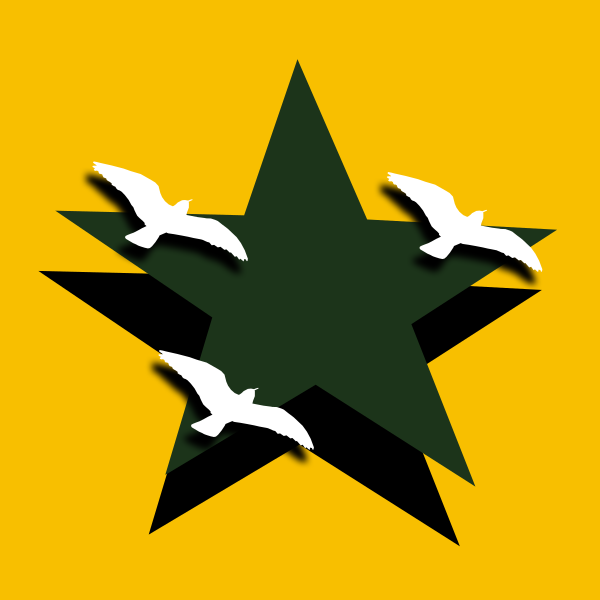 This features a yellow background with a green star in the center. Surrounding the star are three birds, each flying at different heights and angles. One bird is positioned above the left side of the star, another is flying to the right of it, and the third bird is located below the middle of the star. The birds appear to be soaring through the sky, creating a sense of motion in the image.