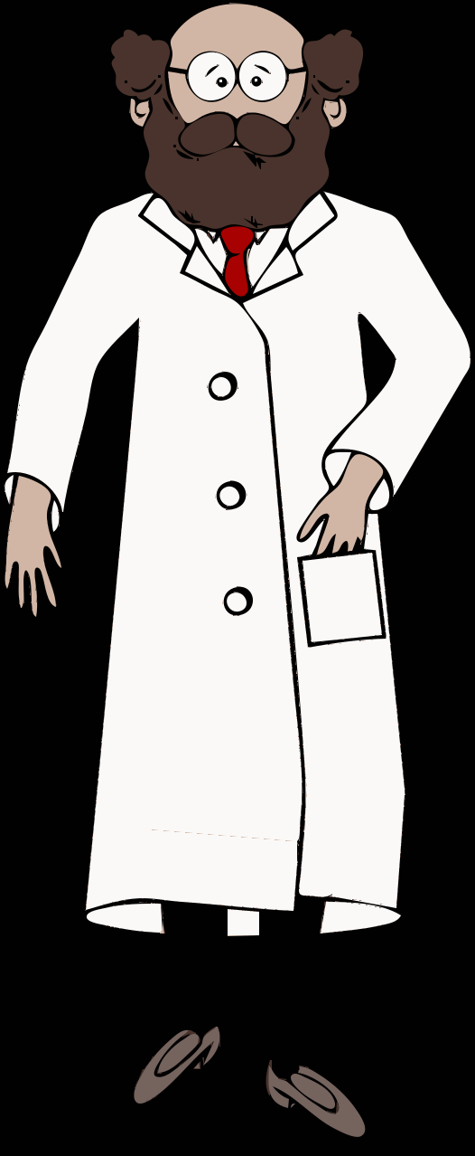 This features a cartoon drawing of an old man wearing a white lab coat and glasses. He is standing with his hands on his hips, giving the impression that he is posing for a picture. The man's beard appears to be brown in color, adding to his distinguished appearance. The overall scene has a black background, which further emphasizes the man as the main subject of the image.