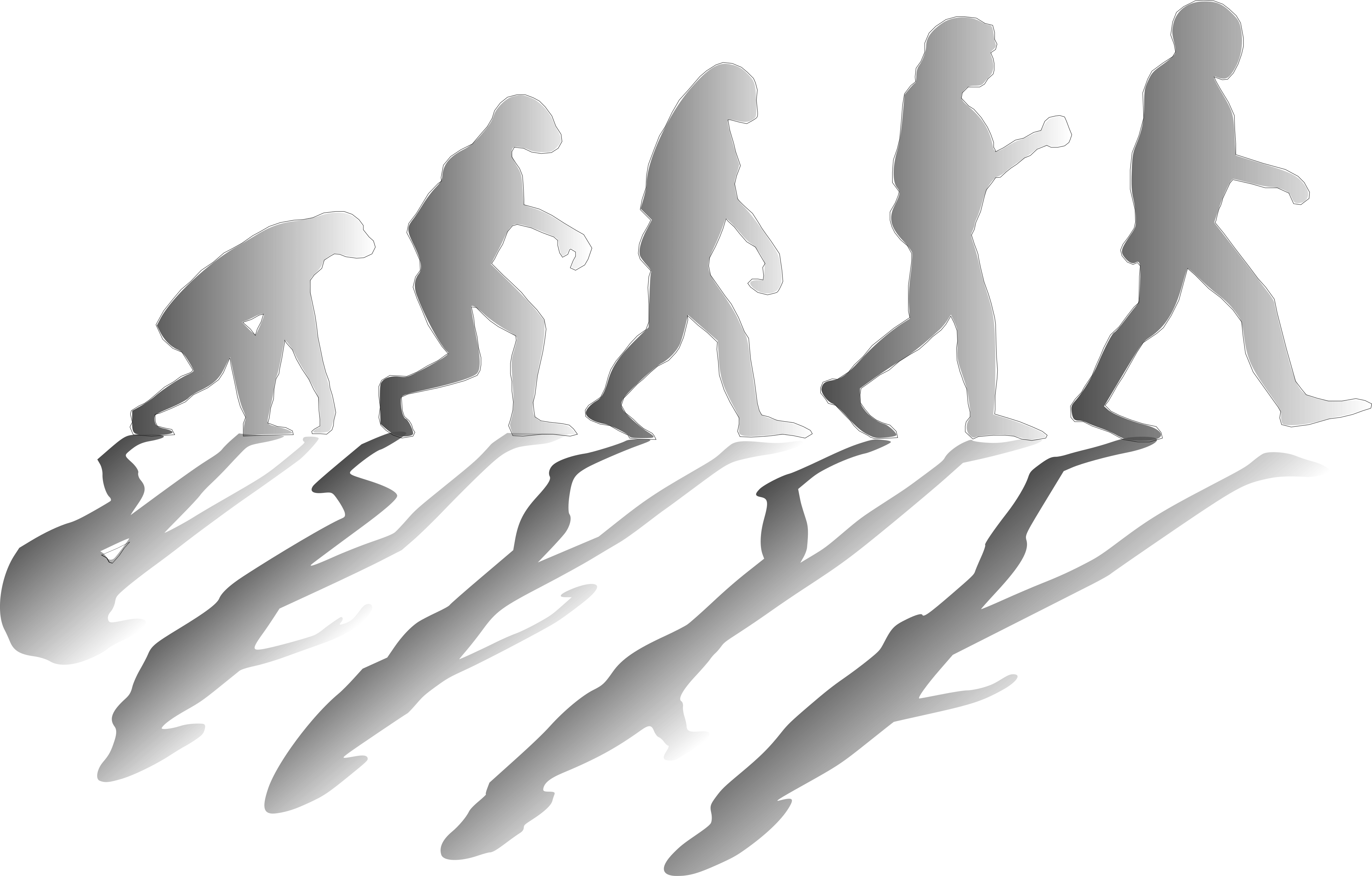 This features a series of five silhouettes, each representing different stages in human evolution. The first silhouette is that of a monkey, symbolizing the earliest stages of human development. Following this, there are four more silhouettes, each depicting a progressive stage of human evolution, culminating with the final silhouette representing a fully developed human being. The shadows created by these silhouettes create an interesting visual effect on the ground, giving the impression that they are walking across it. The arrangement of the silhouettes and their progression from monkey to human highlights the evolutionary journey that humans have undergone throughout history.