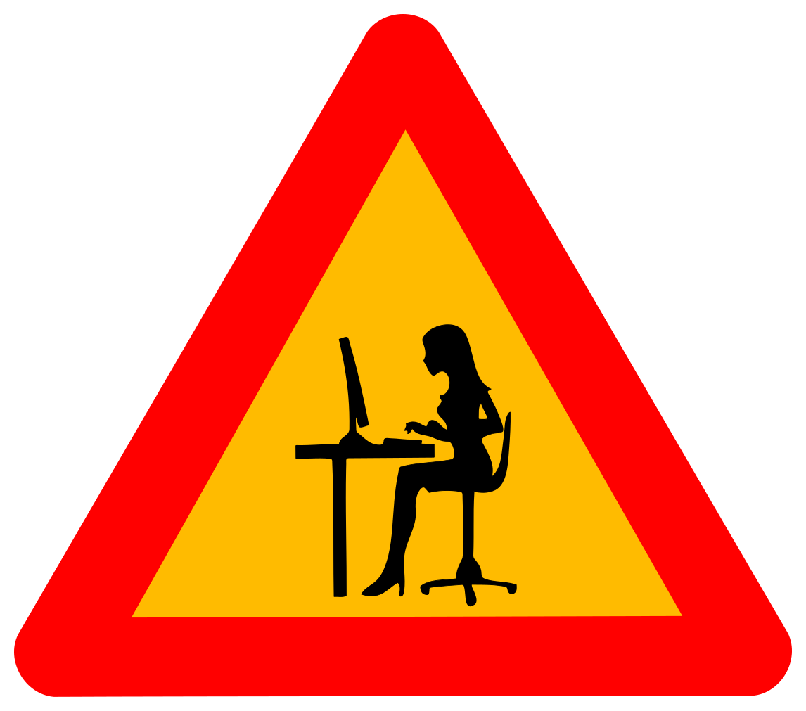 This features a red triangle sign with a woman's silhouette in the middle, depicting her working on a laptop. She is sitting at a desk and appears to be focused on her task. The sign has a yellow outline, making it stand out against the background. The scene suggests that this could be an advertisement or warning related to computer usage or technology.
