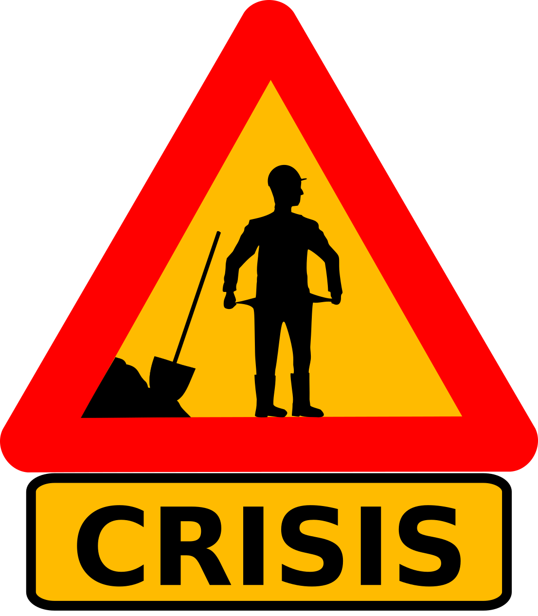 This features a triangle-shaped sign with a red outline, warning of an impending crisis. At the bottom of the sign is a rectangular sign that reads "CRISIS." The sign also has a man's silhouette on it, indicating that the crisis may involve human activity or intervention. This sign serves as a visual representation of potential danger and emphasizes the importance of being prepared for unexpected situations.