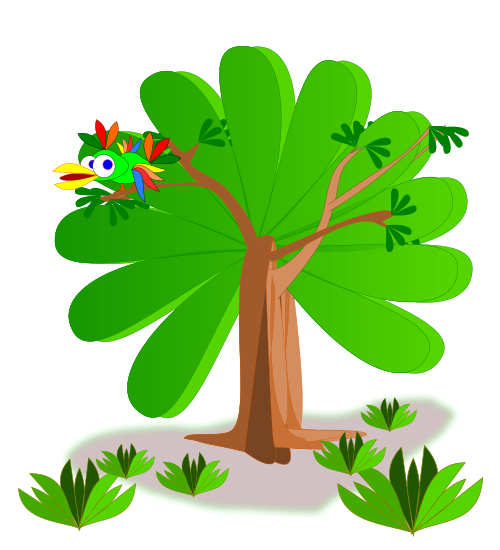 This features a colorful bird perched on the branches of a large green tree. The tree has a thick brown trunk and is surrounded by small patches of grass, giving it an outdoor, natural setting. The vibrant colors of the bird contrast beautifully with the lush greenery of the tree, creating a visually appealing scene.