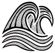 This features a black and white illustration of two large waves facing right. The waves are filled in with small black dots, giving the appearance of a textured design. The waves are positioned close to each other, creating an interesting visual effect. This artistic representation of ocean waves is likely used as a decorative element or symbol for various purposes, such as on clothing, accessories, or home décor items.