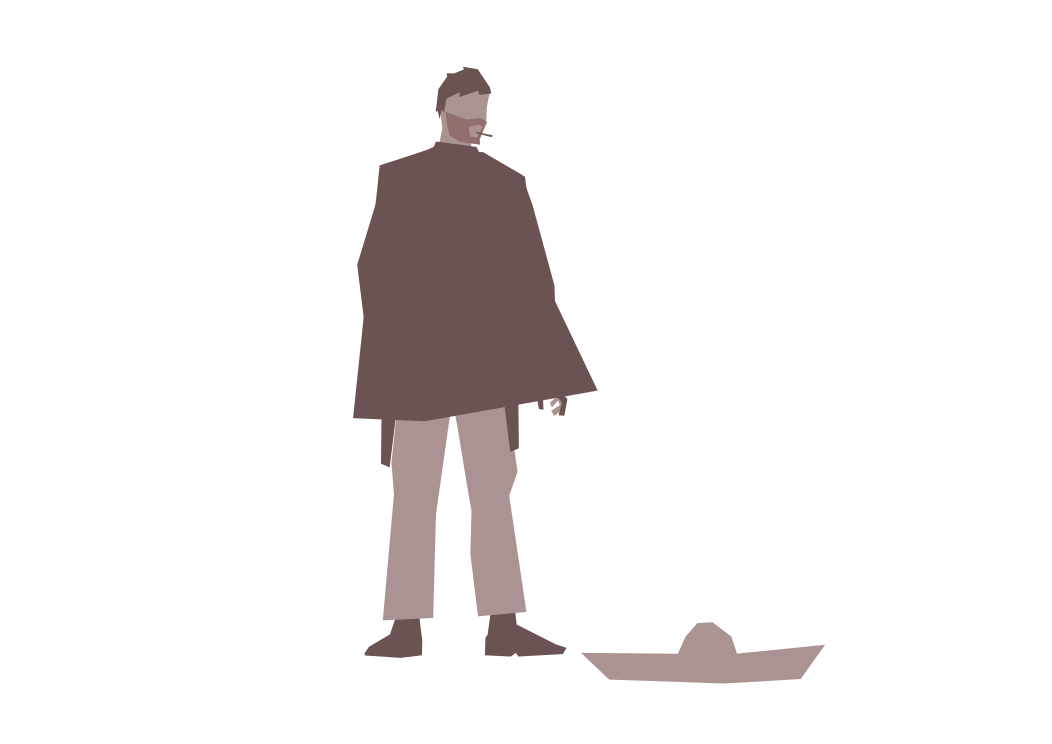 This features a man standing in the foreground, wearing a brown cape. He is positioned next to an object that resembles a cowboy hat lying on the ground. The man appears to be looking down at the hat, possibly admiring it or contemplating its presence. The scene has a vintage feel with the man dressed in a cape and the hat lying on the floor.