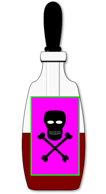 This features a small bottle with a purple sticker on it, which has a skull in the middle. The bottle is filled with brown liquid and appears to be half full. It seems like an interesting or potentially dangerous item, possibly related to poison or other hazardous substances. The bottle's design and color combination of pink and purple make it stand out against a plain white background.