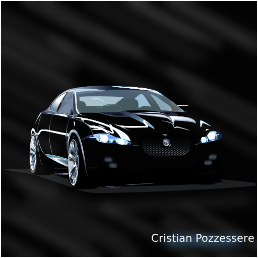 This features a black sports car with blue headlights, parked on a black ground. The car is positioned in the center of the scene and appears to be the main focus of the photo. In the bottom right corner of the image, there is a name written: Cristian Pozzessere. This suggests that the photographer or artist may have wanted to credit the person who took the picture or created the artwork. The black background provides an uncluttered and dramatic backdrop for the car, emphasizing its sleek design and striking appearance.