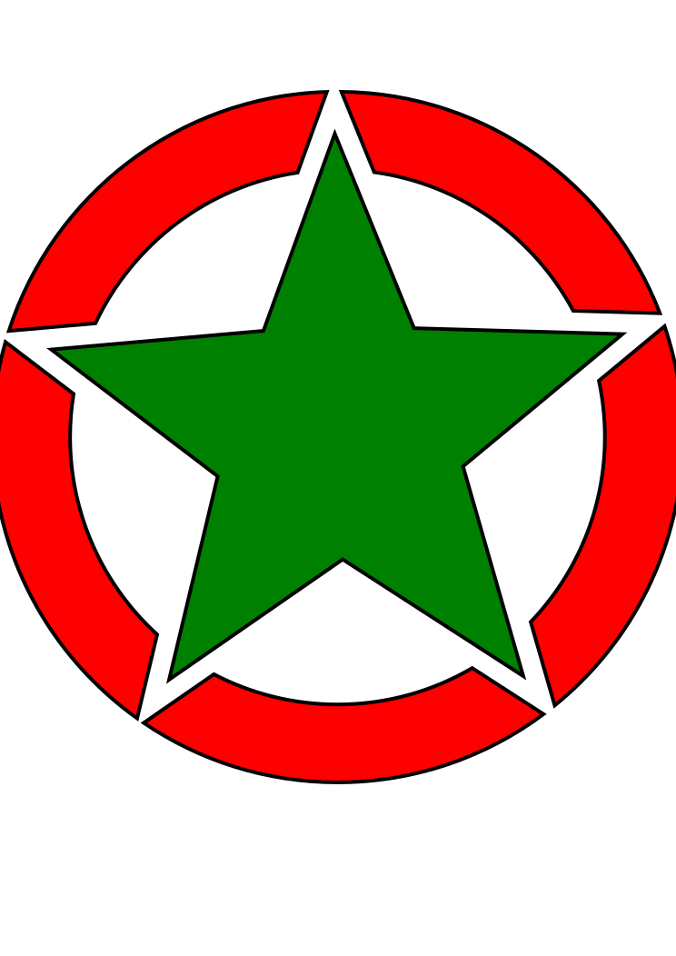 This features a red and green star emblem, which is the logo for the United Nations. This symbol represents the organization's commitment to peace and cooperation among nations. The star has five points, with each point being colored in red, white, and green. The colors of the star are significant as they represent the national flags of France (green), Germany (white), Italy (red), Japan (white), and the United States (red). This combination of colors signifies unity among these nations and their shared values.
