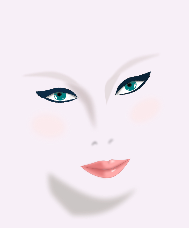 This is a close-up of a woman's face, featuring her lips, cheeks, and eyes. Her lips are painted with a light coral color, while her cheeks have a rosy hue. The eyes are adorned with blue-green liner, adding a striking contrast to the rest of her features. The overall effect is an artistic representation of a woman's face, highlighting her unique beauty and individuality.