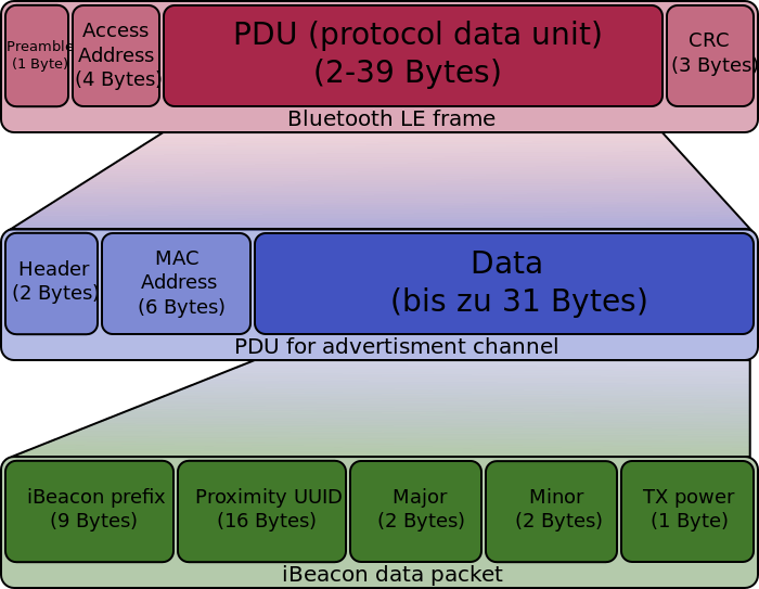 This displays a diagram that shows the different layers of data. At the top, there is an arrow pointing to the left and reads "Data Header." Below it, there are three headers with several blocks in them. Each block has its own size in bytes. Below the headers, there is a section labeled "PDU (Protocol Data Unit)." This area contains information about data packets and their sizes. The diagram also includes a section for "CCR (Common Coding Rules) 1-4 Bytes." Below this, there are two sections: "BlueTooth LE Frame" and "Data." The image is organized in such a way that it provides an overview of the data structure and its components. This diagram can be helpful for understanding how data is processed and transmitted through various channels.