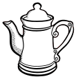This features a large, ornate teapot with a handle on the side. It is depicted in black and white line art, giving it an old-fashioned appearance. The teapot has a spout at one end and a lid at the other, making it suitable for serving tea or coffee. The design of the teapot suggests that it may have been used in earlier times, adding to its charm and historical significance.