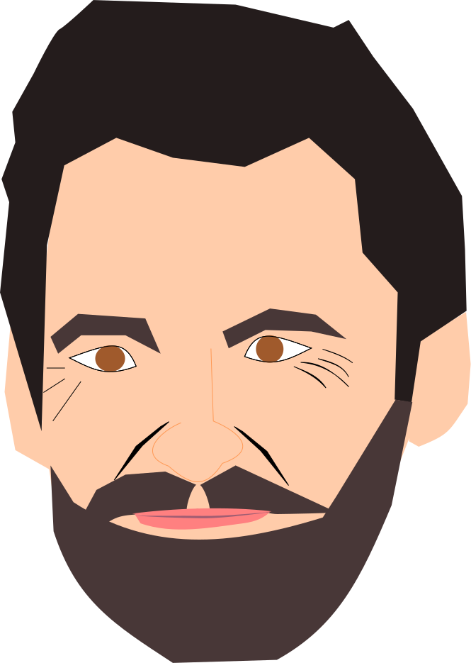 This is a cartoon drawing of a man's face, featuring a beard and mustache. He appears to have a smiling expression on his face, giving the impression that he is happy or content. The drawing is in black and white, which adds an artistic touch to the overall appearance. The man's eyes are open, and his facial features are well-defined, making him look like a real person despite being a cartoon representation.