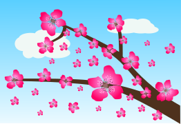 This features a beautiful cherry blossom tree with pink flowers blooming on its branches. The tree is situated in front of a blue sky and two small white clouds, creating a serene atmosphere. The tree has several branches that are filled with the vibrant pink flowers, making it an eye-catching scene. This image captures the essence of springtime and the beauty of nature.