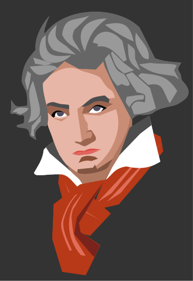 This features a portrait of Ludwig van Beethoven, the famous composer. He is depicted with gray hair and wearing a red scarf around his neck. His facial expression appears to be serious as he stares directly into the camera. The portrait captures the essence of this iconic figure in music history.