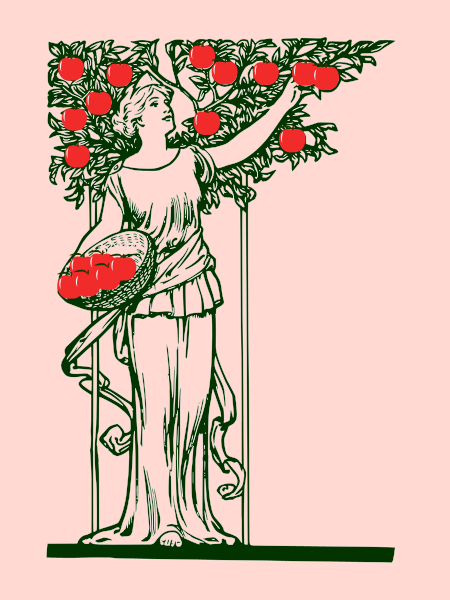 This features a woman dressed in classical attire, holding an ornate basket filled with red apples. She is standing next to a tree that has many green leaves and is adorned with more apples. The woman appears to be picking the apples from the tree, showcasing her skillfulness in this activity. The scene exudes a sense of elegance and grace, as the woman's attire complements the natural beauty of the apple tree and its fruit.