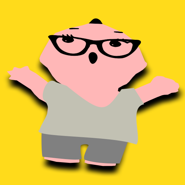 This features a cartoon character, possibly a Kewpie doll, wearing glasses and a grey shirt. It is standing in the center of the frame with its arms wide open, giving off an impression of being welcoming or friendly. The background is bright yellow, which adds to the overall cheerful atmosphere of the image.