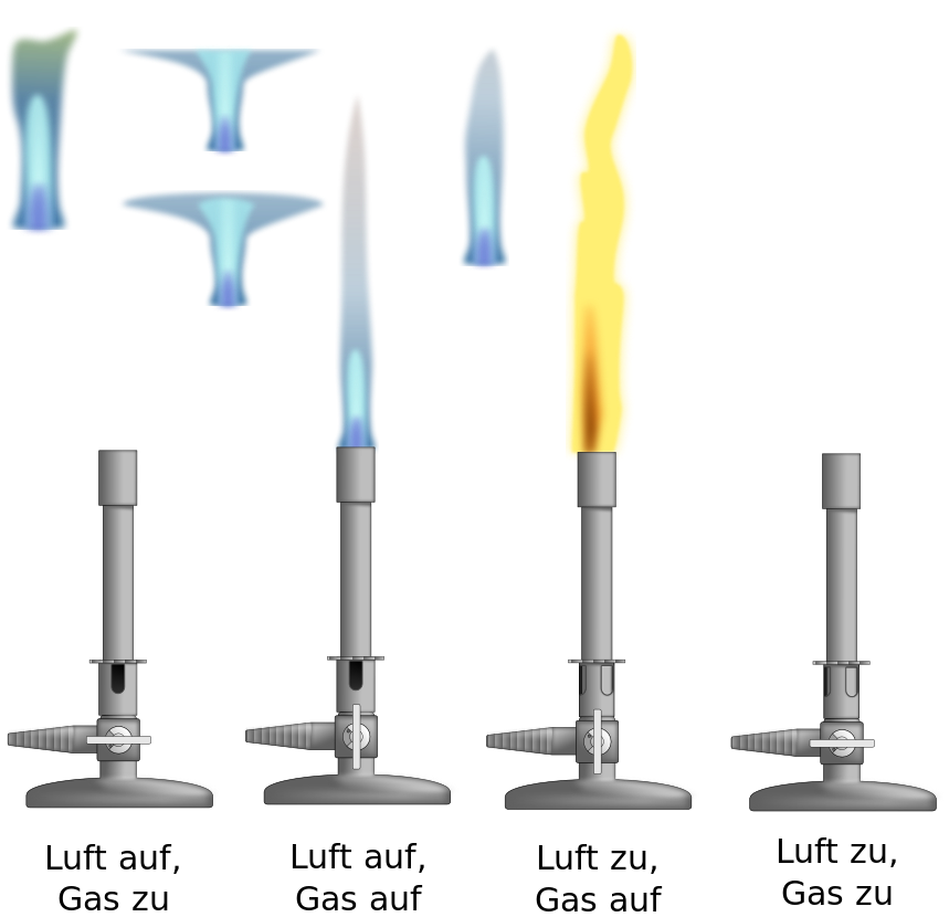 This displays a series of four different colored Bunsen burners, each with varying heights. These burners are labeled with the words "Lufft Au," "Lufft Zu," and "Gas Zu." Each burner has a unique design, making them easily distinguishable from one another. The colors of these burners include blue, yellow, and orange, adding visual interest to the scene.