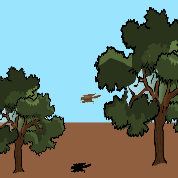 This features a scene with two flying creatures, possibly birds or squirrels, soaring through the air. One of them is closer to the ground while the other one is higher up in the sky. They are surrounded by trees, creating a lush and natural environment for their flight. There are several trees visible in the image, with some being taller than others, providing a diverse landscape for these creatures to navigate through. The overall atmosphere of the scene suggests an outdoor adventure or exploration for these flying animals.
