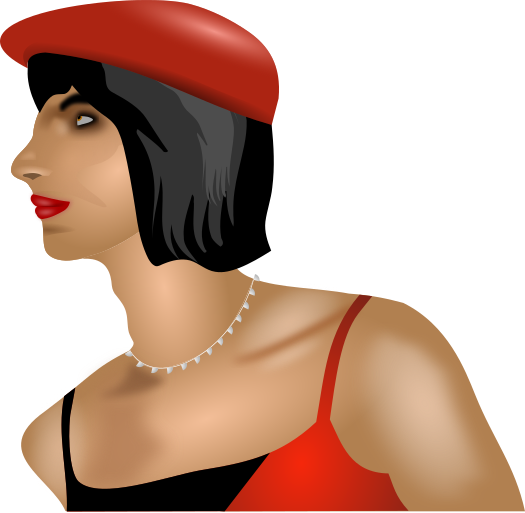 This features a woman wearing a red dress and a red hat, with her head turned to the side. She is looking off into the distance, possibly observing something or someone in the background. Her outfit appears to be stylish and eye-catching, making her stand out from the rest of the scene. The woman's pose suggests that she might be posing for a photo or simply enjoying her time at an event or gathering.