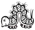 This features a caterpillar with an odd shape, resembling a spiky ball. It is depicted in black and white, giving it a unique appearance. The caterpillar's body is filled with small dots, adding to its distinctive look. The drawing of the caterpillar appears to be a close-up view, showcasing its intricate details.