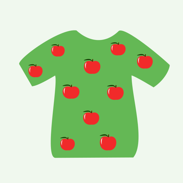 This features a green t-shirt with an apple design on it. There are ten apples in total, each one placed at different positions across the shirt. Some of the apples are located near the top left corner, while others can be found towards the center and bottom right side of the shirt. The overall appearance is that of a colorful and playful design on the t-shirt.
