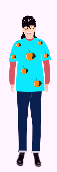 This features a woman wearing a blue shirt with an orange pattern, which includes apples and oranges. She is standing in front of a wall, possibly posing for the picture. Her outfit appears to be casual and comfortable, making her look approachable and friendly. The combination of the blue shirt and the orange pattern creates a visually appealing contrast that draws attention to both the woman's clothing and her overall appearance.