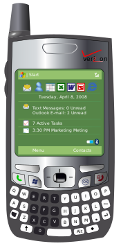 This features a cell phone with a large screen displaying various applications. On the screen, there is an email application that shows a message of zero unread messages. Additionally, the device has a menu button and a contact button on the bottom left corner. A keyboard can be seen below the screen, which allows for easy input of text or commands. The cell phone appears to be a smartphone with multiple functions available for use.