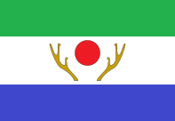 This features a flag with three deer antlers on it. These antlers are located in the top left, middle right, and bottom right sections of the flag. The flag also has a circle in the center, which is likely the sun. This unique design gives the flag an interesting appearance.