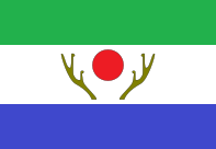 This features a flag with three deer antlers on it. These antlers are located in the upper left, middle, and lower right sections of the flag. The flag also has a sun symbol in the center, adding to its unique design. The colors used for this flag include green, blue, red, and white. The combination of these colors creates an eye-catching and visually appealing display.