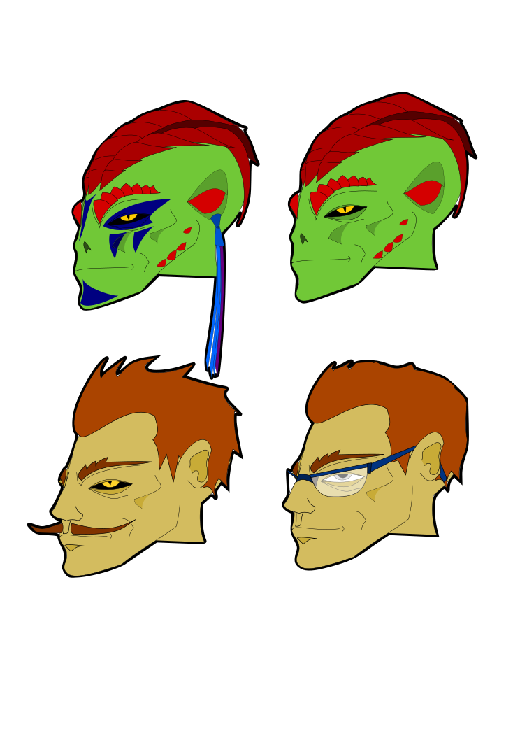 This features four different cartoon heads, each with unique characteristics. One of the heads is a reptile head taking on human form, while another has a distinctive red hairstyle. Two other heads are wearing glasses, one with blue lenses and the other with clear ones. Each of these heads appears to be part of an artistic collection or display. The cartoon characters seem to be drawn in a colorful style, adding vibrancy to the overall composition.
