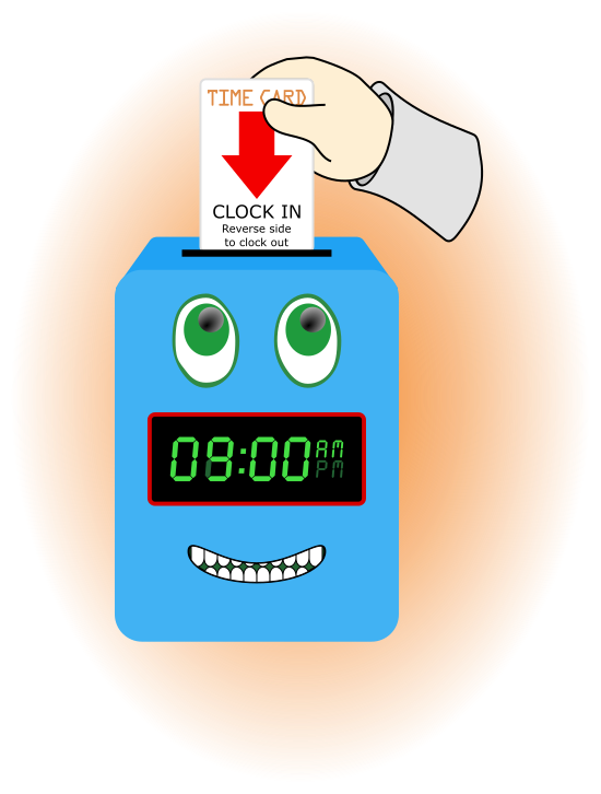 This features a cartoon style time clock with a blue face and green eyes. A person is holding up a time card, which reads "Time Card." The clock has a smiley face drawn on it, adding a playful touch to the scene. The time displayed on the clock is 9:09 pm. The overall atmosphere of the image suggests that this could be an advertisement or promotional material for a product related to time management or scheduling.
