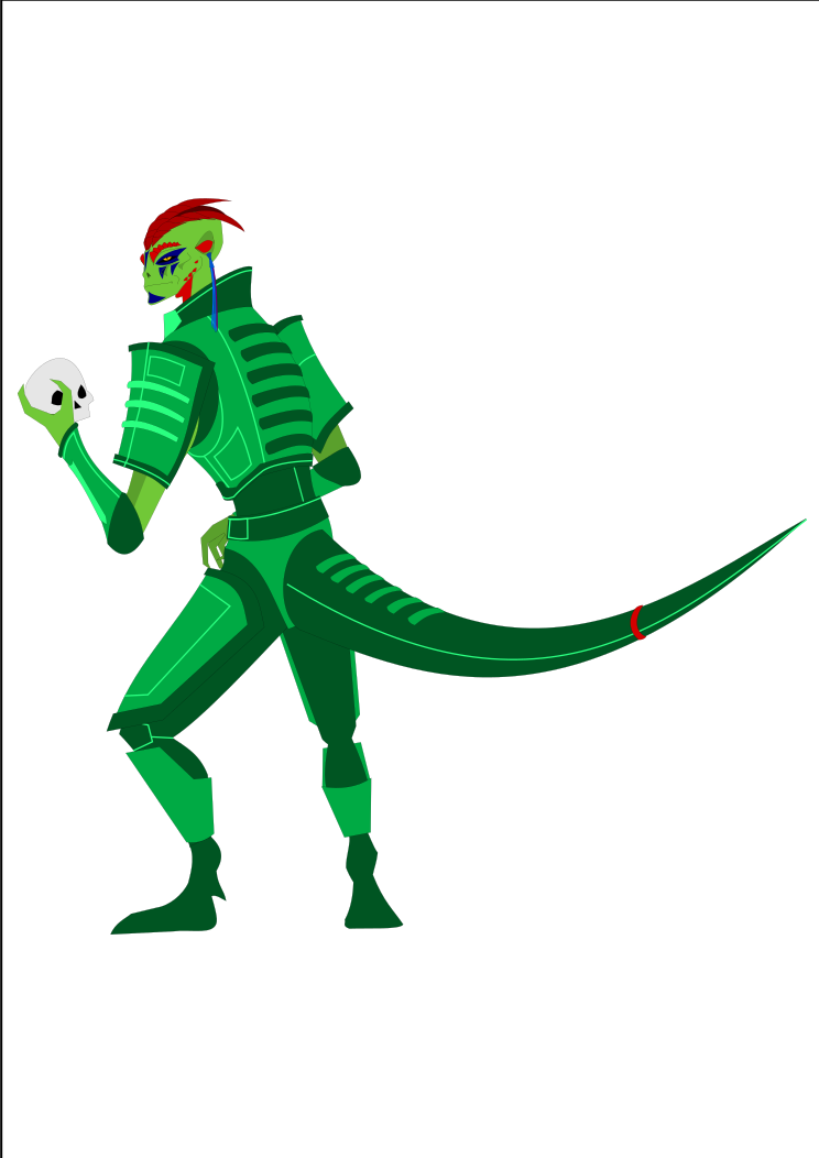 This features a cartoon character, possibly an alien or dinosaur, standing in the center of the frame. This character is holding a white ball in its hand and appears to be wearing a green suit with red accents. The overall scene has a vibrant and colorful appearance, making it visually appealing.