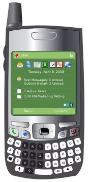 This features a cell phone with its screen open to the home page. On the screen, there are several icons and text displayed, including a menu button at the bottom left corner of the screen. A keyboard is also visible on the screen, indicating that this is likely an old-style flip phone. The display shows various options such as contacts, marketing meetings, and other applications. This image gives off a retro vibe with its design and layout.