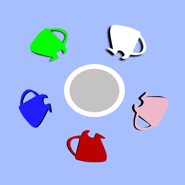 This features a blue background with six different colored cups placed around the center. These cups are of various sizes and shapes, creating an interesting visual effect. They are arranged in such a way that they all appear to be connected by a central point, giving the impression of a circle or a wheel. Each cup has a unique color, including red, blue, green, pink, white, and orange. The cups are placed at different angles and distances from each other, adding depth and complexity to the overall composition.