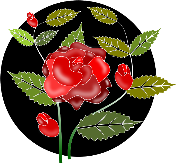 This features a beautiful red rose with green leaves, sitting in the center of an intricate design. Surrounding the rose are several other red flowers, creating a captivating bouquet. These additional flowers are scattered throughout the scene, adding depth and dimension to the overall composition. The combination of the central red rose and its surrounding flowers creates a visually appealing and harmonious display.