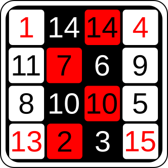 This features a black and red grid with numbers on it. There are several combinations of the numbers that add up to thirteen, which is the number 13. The grid has a total of fifteen squares, each containing either a number or an empty space. Some of these spaces have been filled in with red numbers, while others remain blank. The image appears to be a puzzle or game, challenging players to find all possible combinations that add up to thirteen using the available numbers and spaces on the grid.