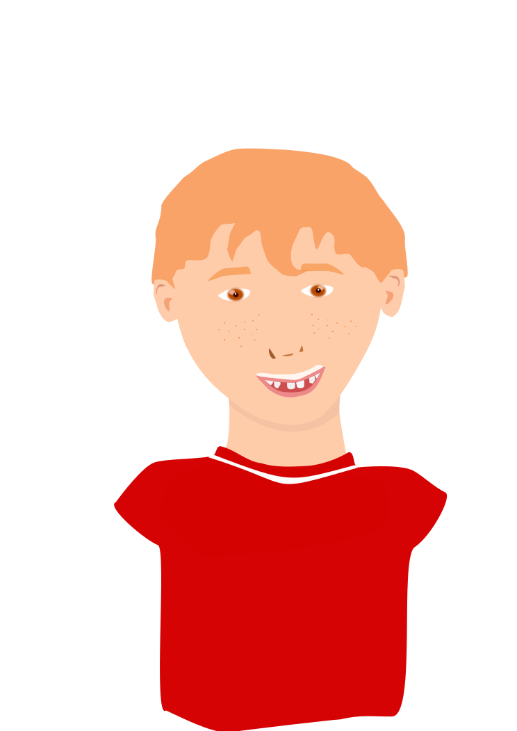 This features a red-haired boy with freckles on his face, wearing a red shirt. He is smiling and has a tooth missing from one of his teeth. The boy appears to be the main focus of the picture, taking up most of the frame.