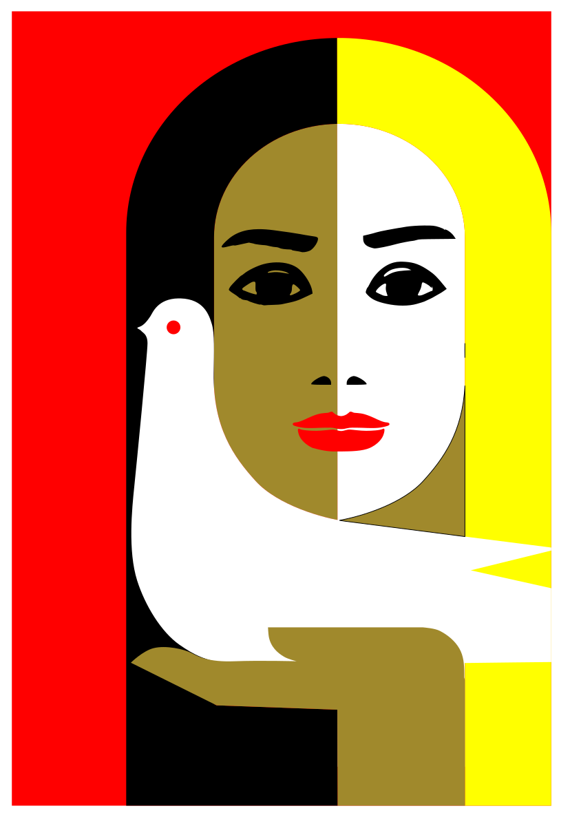 This features a woman with blonde hair and black hair, holding a pigeon in her hands. She is wearing a black shirt and has a peaceful expression on her face. The background of the image is red, which adds to the overall color scheme of the artwork. The woman's face appears to be split into two sections, with one half being darker than the other, creating an interesting visual effect. This unique design choice makes the image stand out and draws attention to the subject.
