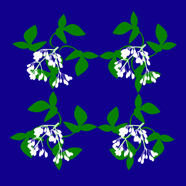 This features a blue background with white flowers and green leaves arranged in an artistic pattern. There are six distinct clusters of the flowers, each varying slightly in size and positioning. These clusters create a visually appealing composition that draws attention to the beauty of nature. The white flowers contrast nicely against the deep blue backdrop, creating a striking visual effect. Overall, this image showcases an elegant arrangement of flowers and leaves that can be appreciated for their intricate details and harmonious colors.