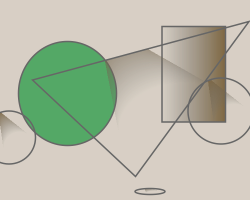 This features a unique and interesting composition of various geometric shapes. There are three circles, one large green circle in the center, and two smaller circles on either side. Additionally, there is a square shape located near the top left corner of the image. A triangle can also be seen at the bottom right corner. The arrangement of these shapes creates an intriguing visual effect that draws attention to the composition. The large green circle appears to be in focus while the other shapes are slightly blurred, giving a sense of depth and dimension to the scene. Overall, this image showcases creativity and artistic expression through geometric forms.