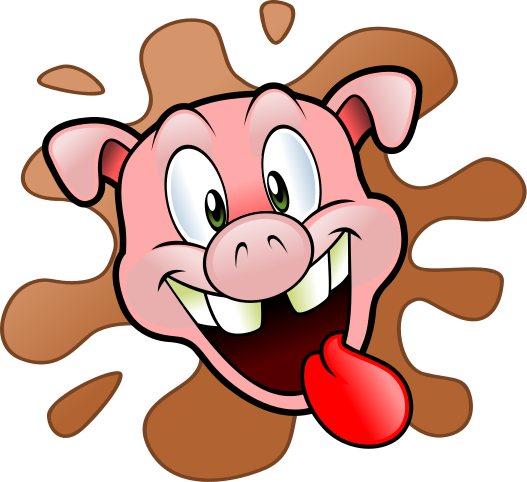 This features a happy pink pig with its tongue sticking out. It is the main focus of the picture, and it appears to be smiling or laughing. The pig's head is positioned in the center of the scene, surrounded by brown mud that adds an element of playfulness to the image. This cartoon-like illustration could be used for various purposes such as advertising, children's books, or even as a decorative piece on a wall. The pig's facial expression and the muddy background create a fun and lighthearted atmosphere that is sure to catch viewers' attention.