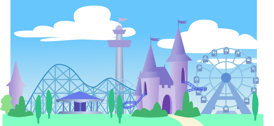 This features a colorful and whimsical amusement park with various rides and attractions. A roller coaster is prominently displayed, as well as a ferris wheel and a merry go round. In addition to these classic carnival games, there are also two large castles in the scene, one purple and the other white. The sky above the park is bright blue with two clouds, adding to the overall charm of the illustration.