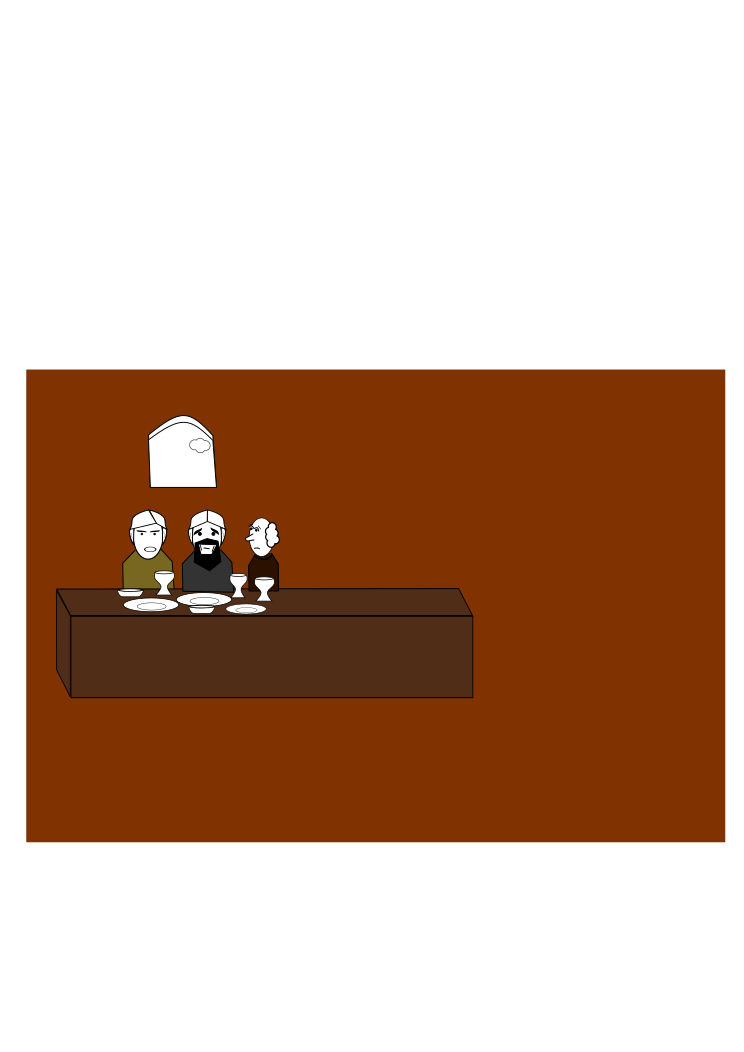 This is a cartoon drawing of three people sitting at a table, which appears to be a brown desk. Each person has a cup in front of them, suggesting that they are enjoying a meal together. One person is on the left side of the table, another is in the middle, and the third one is on the right side. The scene gives off an impression of a casual gathering or a friendly get-together among these individuals.