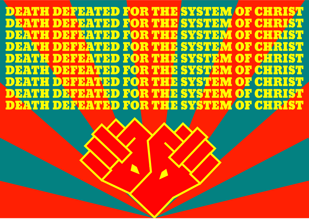 This is a colorful poster with the words "Death Defeated for the System of Christ" written in bold letters. The poster features a red background and has several yellow and orange accents, giving it an eye-catching appearance. In addition to the main text, there are smaller words scattered throughout the poster, adding depth and detail to the design. Overall, the poster conveys a powerful message about overcoming death through faith in Christ.