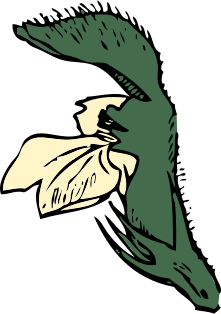 This features a green dragon with its mouth open, as if it is about to eat something. It appears to be in the middle of an action scene, possibly engaging in a battle or capturing prey. The dragon's mouth is filled with a piece of paper, which seems to be part of the scene. This could indicate that the dragon has just consumed its prey or captured something important for it. The overall atmosphere of the image suggests an adventurous and exciting moment in the life of this mythical creature.