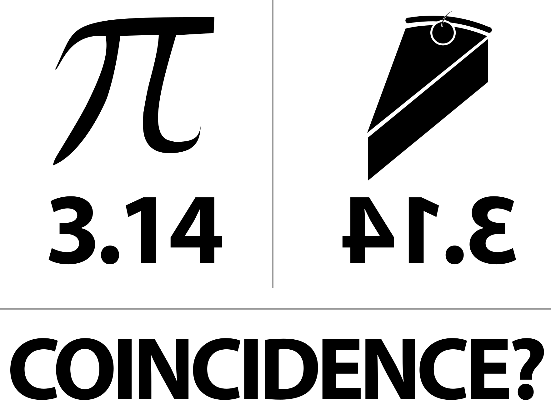 This is a black and white picture that celebrates Pi Day, which falls on March 14th. The picture is divided into two parts, with the first part featuring the mathematical symbol for pi along with the number 3.14 underneath it. The second part of the picture showcases a slice of pie with the number 3.14 written backwards to resemble the word "pie." Under both pictures, there is a phrase that reads "coincidence?" which suggests that the image might be questioning whether or not this coincidence is intentional.